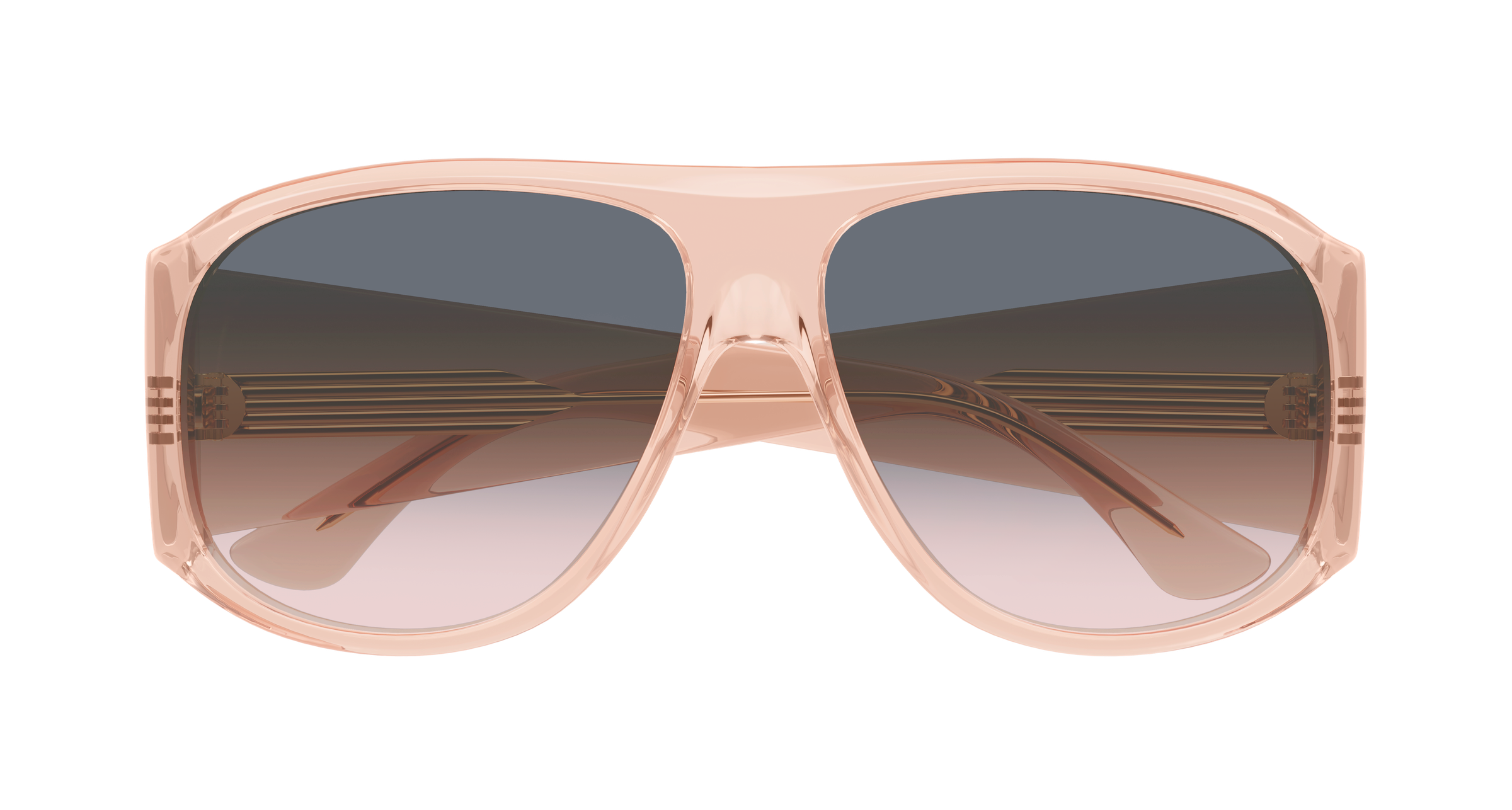 A armação em acetato transparente-pêssego (orange/peach) com acabamento brilhante confere um visual luminoso e contemporâneo. As lentes em degradê duplo cinzento para rosa oferecem proteção e suavidade, adicionando um charme extra ao conjunto.