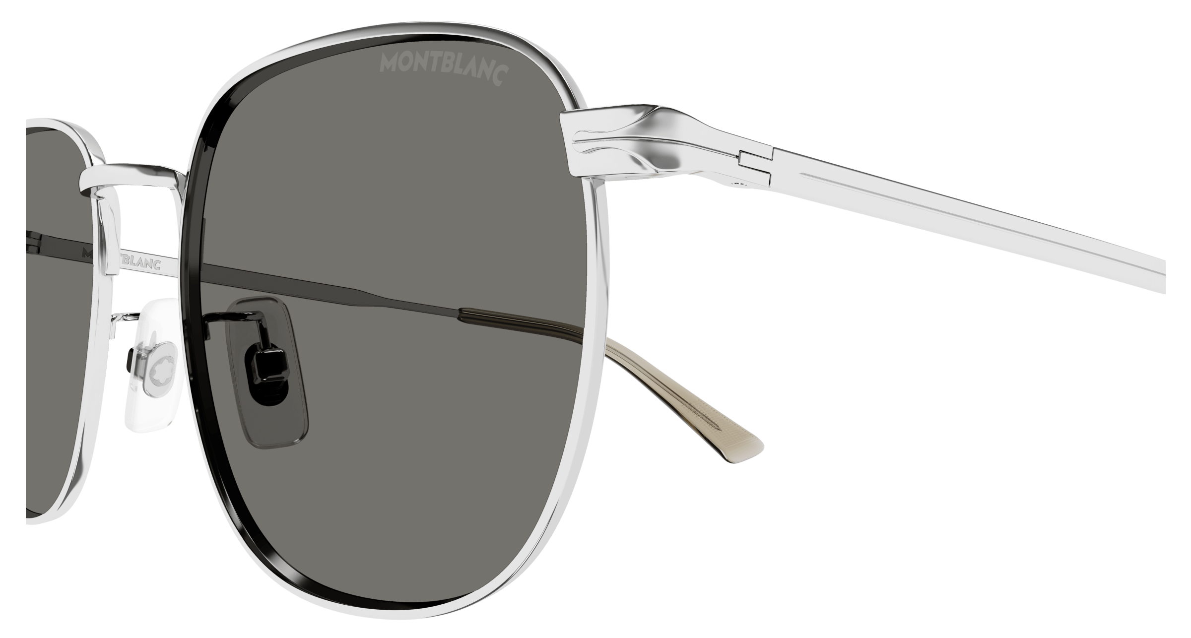 Modelo de óculos de sol da família “Nib”, caracterizado por um formato quadrado, pequeno e moderno, inteiramente em metal. O novo elemento da marca é representado pelo ícone “Nib”, que realça as ponteiras de uma forma distinta, mas subtil. O logotipo “Montblanc” é gravado a laser nas hastes. O modelo apresenta as pontas das hastes de cor champanhe nas referências prateada e ruthenium escuro.